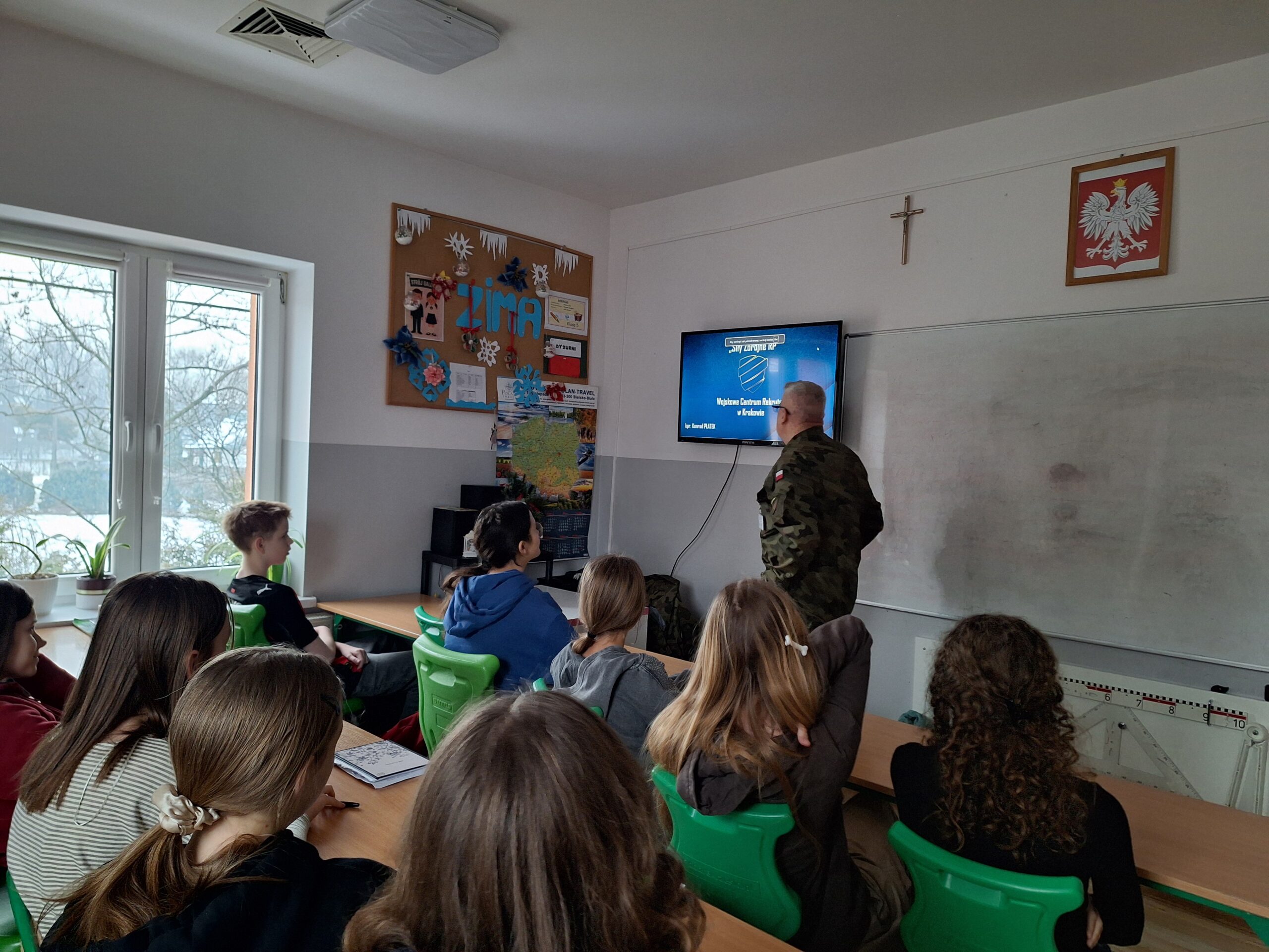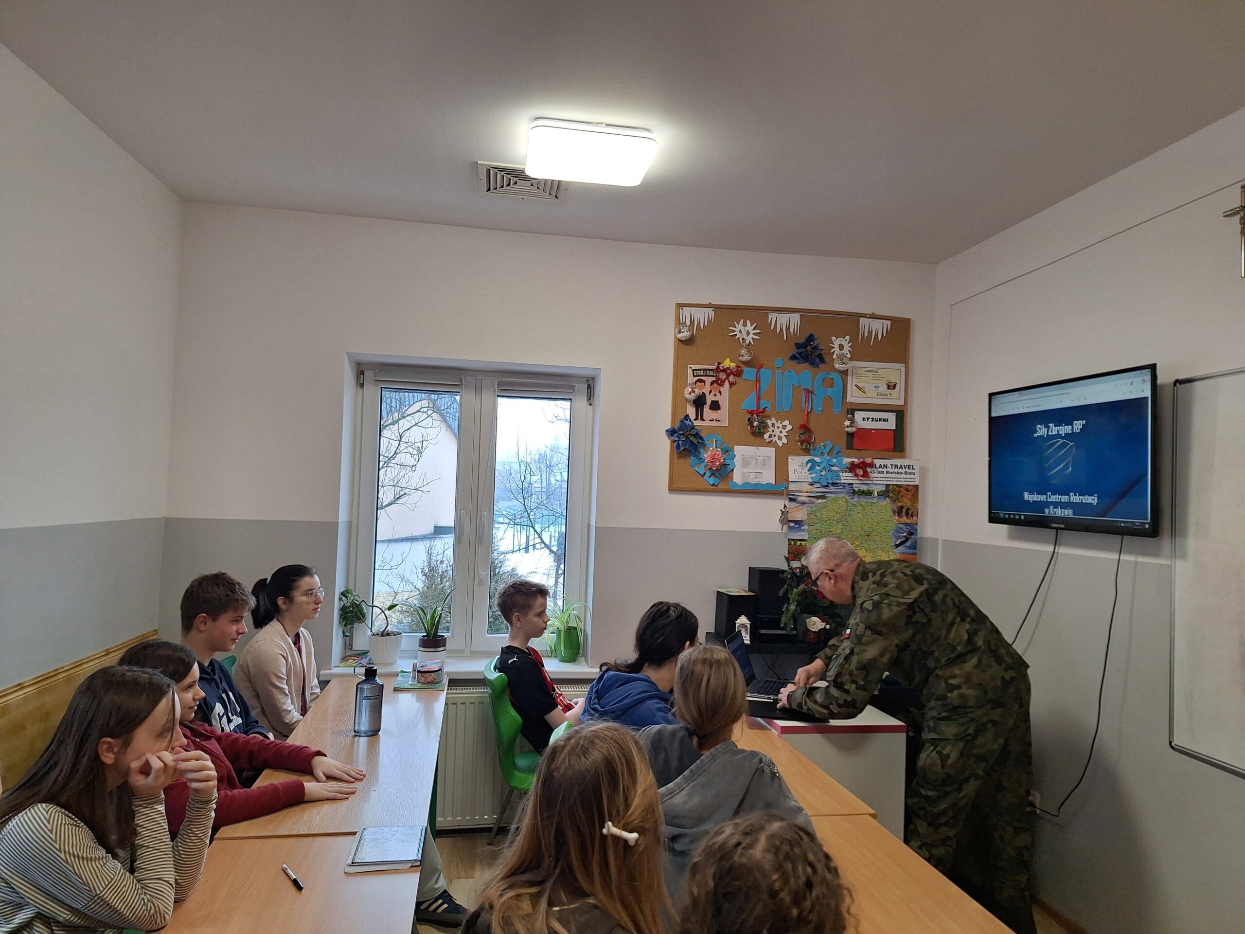 W dniu 22 stycznia odwiedził nas kapitan Wojska Polskiego z prezentacją jednostek wojskowych w województwie małopolskim. Dowiedzieliśmy się o Służbie Terytorialnej, odznakach mundurowych i istniejących klasach wojskowych. Kapitan opowiadał o przebiegu zasadniczej służby wojskowej, szkoleniach i możliwościach rozwoju, które oferuje Wojsko Polskie.